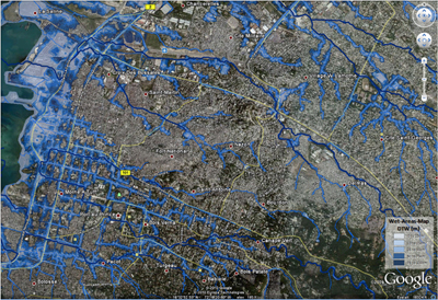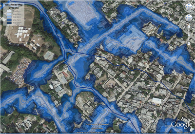 The image on the right depicts the LiDAR-derived wet-areas and related cartographic depth-to-water index map for the Port-au-Prince area, with flow channels corrected for flow connections underneath roads and bridges, as inferrred by image inspection and by DEM algorithms used to enforce channel connections across roads automatically.