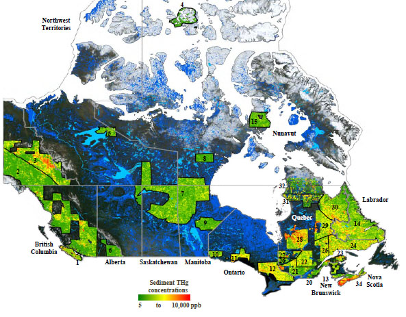 This web site will soon display details of the Hg modelling and mapping process at the forest stand level, and how the process is applied to discerning Hg concentration patterns according to the open stream and lake sediment files compiled by the Geological Survey of Canada. The image on the left shows a selection of the Geological Survey of Canada open-file data for Hg in lake and stream sediments overlaid on a satellite image for Canada, also containing a blue shaded upland/lowland delineation.