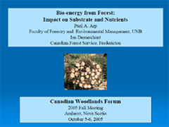 This presentation outlines steps taken to determine the nutrient sustainability of forest biomass harvesting. This is done by balancing nutrient losses due to harvesting and soil leaching with nutrient supplies via atmospheric deposition and soil weathering. The emphasis is on primary nutrient supplies and losses, instead of secondary nutrient cycling processes. Forest managers have taken note of this approach, as a means to determine the suitability of forest stands for biomass harvesting, in areas where soils are not too wet, too steep or too shallow. |